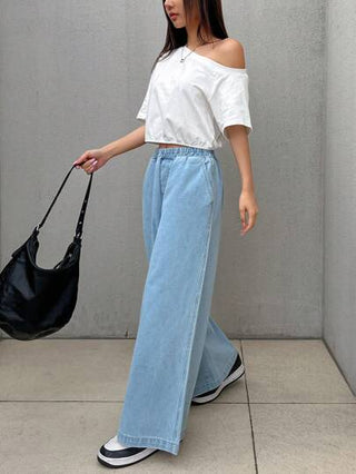 FRIFUL بنطلون جينز واسع الساق مرن الخصر به جيوب للنساء، بنطلون جينز فضفاض للاستخدام اليومي الكاجوال