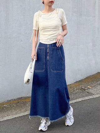 FRIFUL تنورة جينز واسعة عصرية بارتفاع الخصر مهترئة الحافة من المرأة