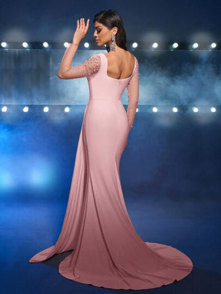 Glamrae فستان سهرة طويل بأكمام طويلة ، فاخر بتفاصيل خرزية و طيّات متموجة في الصدر وخصر مرتفع و قصّة سمكة ، تنورة ممتلئة بكشكشة جانبية ، فستان مثالي لحضور الحفلات والزفاف والمناسبات الرسمية والسهرات