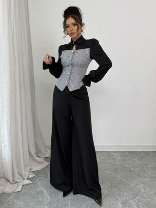 Gloray مجموعة امرأة مكونة من قطعتين: قميص أنيق ذو أكمام طويلة برقبة علوية ومزين بكشكشة، وبنطال ذو سراويل واسعة