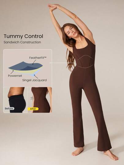 GLOWMODE جمبسوت واسعة ذات رقبة مربعة وظهر على شكل حرف U تحكم البطن مصنوعة من ريش Featherfit™، مناسبة لليوجا والاستخدام اليومي، كؤوس قابلة للإزالة ذات تأثير منخفض