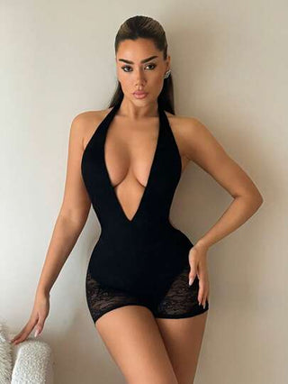 ICON جمبسوت قصيرة عميقة الرقبة بدون ظهر منسوجة بالدانتيل