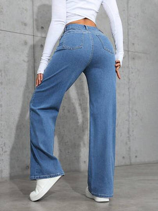 ICON جينز بخصر عالي ذو قدم مستقيمة ذو تصميم بسيط مغسول بشكل عادي