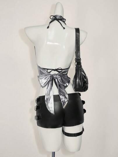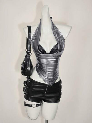 ICON ملابس علوية بلا أكمام وظهر مكشوف بتصميم معلق ذو ملمس معدني، ملابس علوية صيفية للرقص والعطلات، فساتين عصرية للحفلات والحفلات الراقصة لحفل زفاف عادي للضيوف، ملابس علوية للرقص
