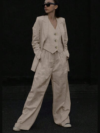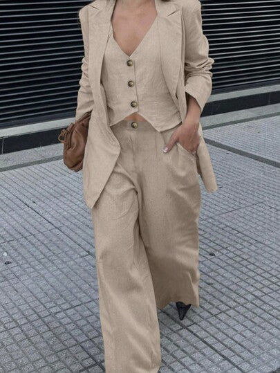 INAWLY بدلة نسائية أنيقة مكونة من بليزر طويل الأكمام ذي زر أمامي وسروال، لون سادة