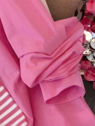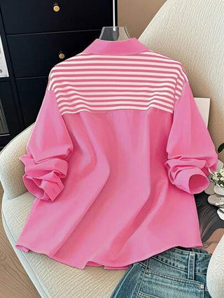 INAWLY بلوزة صيفية نسائية وردية اللون ذات فتحة واحدة ، مرقطة بخطوط ، طويلة الأكمام ، كاجوال