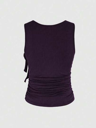 INAWLY بلوزة نسائية أحادية اللون، رقبة دائرية، بلا أكمام، ربطة أمامية، إطلالة عصرية وبسيطة