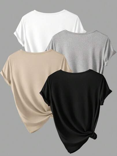 INAWLY تي شيرت موحدة اللون ياقة دائرية 4 قطع