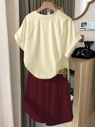 INAWLY طقم تي شيرت بياقة رقلان أكمام قصيرة وشورت بطبعة الكرز للسيدات ، كاجوال