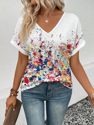 INAWLY قميص تيشيرت نسائي كاجوال أكمام قصيرة بياقة على شكل V مطبوع برسومات الحبر