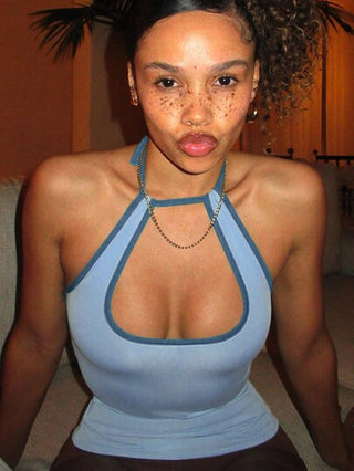 INAWLY ملابس علوية نسائية برباط عنق مفتوح وبدون أكمام، بتصميم متباين الألوان مثالية لموسم الربيع/الصيف العارضة