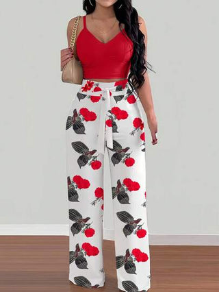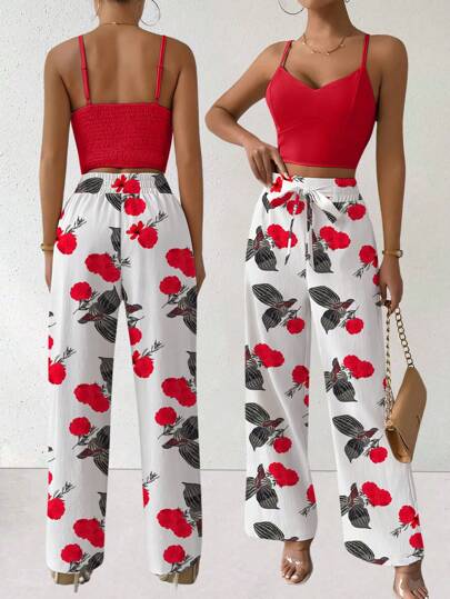 INAWLY مجموعة بنطلون واسع الساق مطبوع بطراز الأزهار مع جذب الخصر وحمالة خالية من الأكمام وردي اللون مكونة من قطعتين