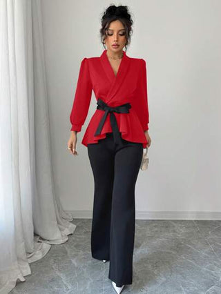 INAWLY مجموعة من قطعتين (جاكيت وبنطلون) نسائية، بأكمام طويلة وياقة على شكل حرف V ، ذات تصميم ملون ومزينة بعقدة فراشة في الوشاح