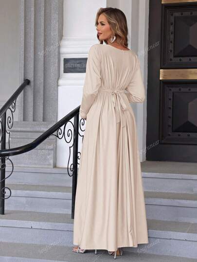 Joyfunear فستان حمل كم طويل بياقة V أحادي اللون بسيط