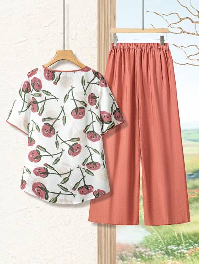 Lacomfia طقم فضفاض بتصميم أزهار 2 قطع ، أكمام قصيرة، طقم كاجوال للسيدات