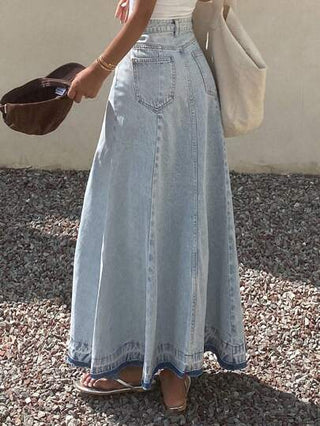 Livesso تنورة ماكسي من الجينز قصيرة التدريج و تصميم رقعة بنمط اللون الداكن كاملة الخصر للسيدات