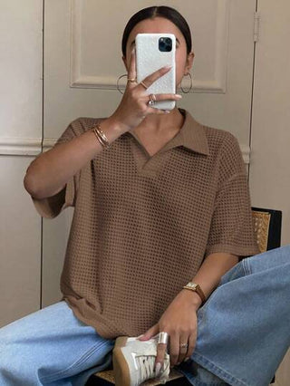 Livesso تي شيرت نسائي ذو ياقة بولو أساسية، لون سادة، أكمام قصيرة متدلية، نسيج فضفاض