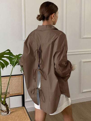 Livesso قميص نسائي أكمام طويلة بياقة مطوية ، شق في الظهر، تصميم ربطة وفيونكة، بلون أحادي فضفاض