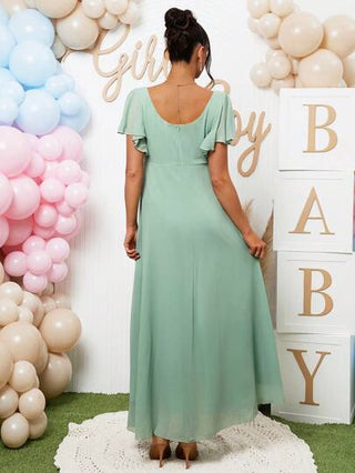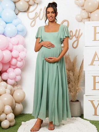 Loomaby فستان طويل بتصميم بسيط مع رقبة مربعة وأكمام قصيرة وذيل مشقوق من قماش أحادي اللون لملابس الحمل