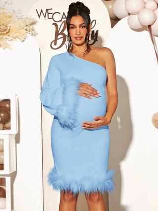 Loomaby فستان حمل طويل الأكمام رسمي أنيق، بياقة غير متماثلة ولون قطعي، مناسب للحفلات والتجمعات، ولحفلات استقبال الطفل
