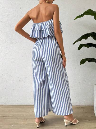LUNE بدلة قصيرة واسعة من الساقين بدون حمالة مع شريط مخطط و حاشية مجمعة للنساء