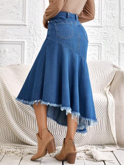 LUNE تنورة جينز أنيقة بحاشية متوترة غير متماثلة على شكل ذيل السمكة للنساء