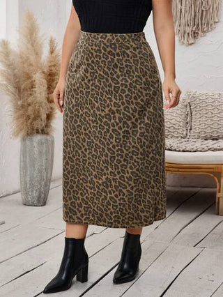 LUNE تنورة ذات خصر عالٍ مطبوعة بنمط النمر بطول متوسط من الدنيم، أنيقة - مقاسات كبيرة