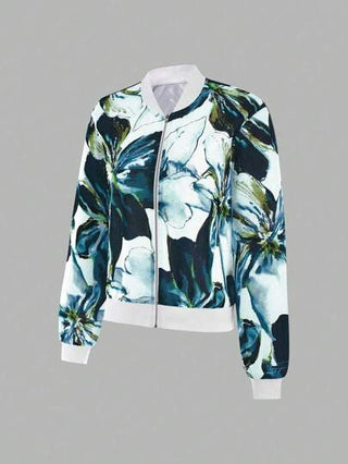 LUNE جاكيت بيسبول كاجوال مزين بطباعة نباتية للنساء مع سوستة أمامية مناسب للعطلات