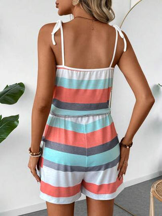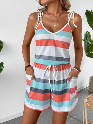 LUNE رومبير نسائي مخطط ملون لعطلة الصيف مزين بعقدة ذاتية الربط على العنق على شكل V ، خصر مشدود برباط وجيوب.