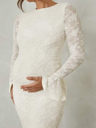 MaterniChic فستان أنيق للحمل بطبعة زهور جاكارد وياقة مستديرة وأكمام فرفرة وذيل سمكة