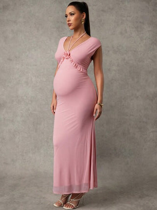 MaterniChic فستان أنيق للنساء الحوامل ذو لون أحادي بزخرفة نباتية ثلاثية الأبعاد، فستان للحمل