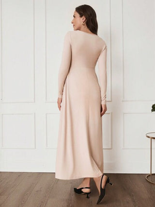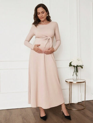 MaterniChic فستان طويل أخضر كاكي للحوامل، فستان حمل طويل جسم أنيق مربوط بربطة فراشة للنساء في الخريف