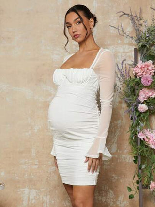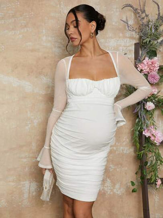 MaterniChic فستان نسائي أبيض أنيق بأكمام طويلة مطوي بقصة بسيطة للمناسبات البيضاء، فستان بيضاء لحفلات الاستقبال ، فستان أنيق للنساء للحفلات ولسهرة رومانسية، فستان قصير رسمي، فستان عيد الميلاد وعيد الشكر، فستان حمل وأجازة الأطفال