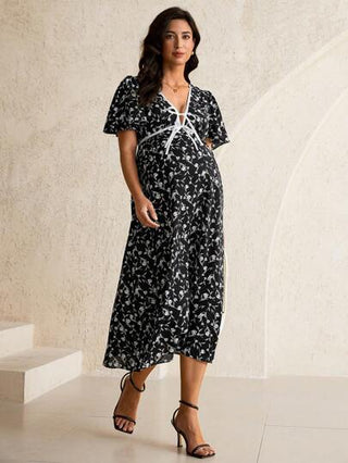 MaterniWear فستان حمل أنيق بطبعة زهور وربطة أمامية وأكمام قصيرة للنساء الحوامل للعطلات