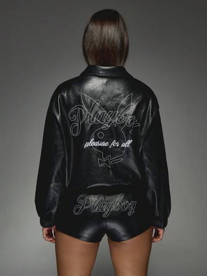 MISSGUIDED Missguided x Playboy سروال قصير من الجلد المستعار مطرز من الخلف