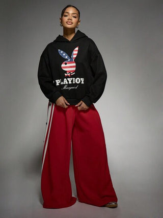 MISSGUIDED Missguided x Playboy هودي واسع مطبوع عليه علم الولايات المتحدة الأمريكية وشعار الرابع من يوليو|حجم مناسب للجنسين