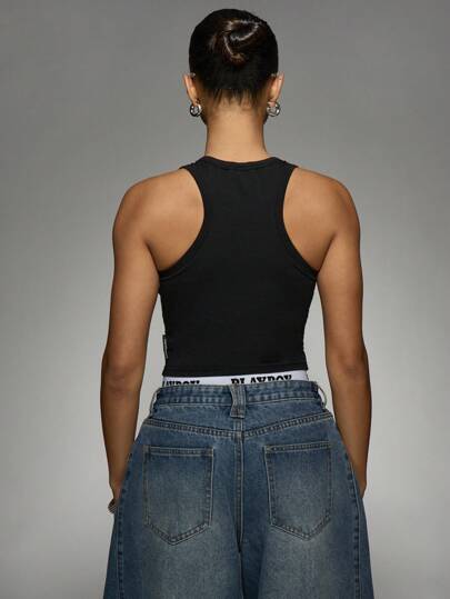 Missguided x Playboy MISSGUIDED تي شيرت كاجوال بلا أكمام رقبة بيضاوية مطبوع عليه أرنب