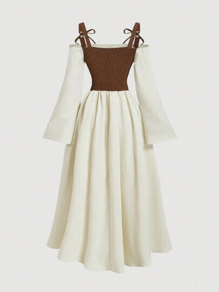 MOD فستان حمل بأربطة عريضة، أمامي مطوي ، كم أجراس، خصر متباين اللون، فستان كاجوال ، فستان متواضع، فستان حفلة، فستان كوكتيل، فستان فينتاج، فستان كرنفال