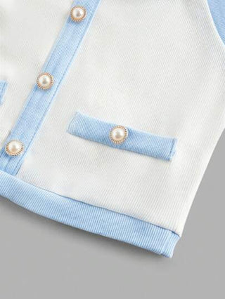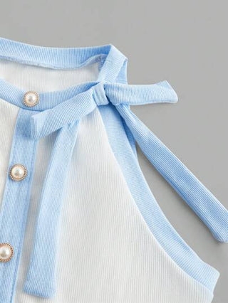MOD ملابس علوية بدون أكمام رقبة دائرية للنساء مزينة بالربطة والأزرار في نمط تدرج اللون الأزرق والأبيض، مناسبة للخروجات الليلية