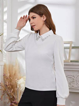 Modelyn بلوزة بأكمام منتفخة وفتحة مزخرفة بالراينية