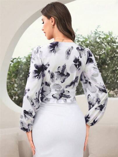 Modelyn قميص أنيق أنثوي مطبوع بزهور لإجازة المرأة مع تفاصيل ربطة