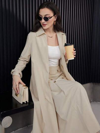Modelyn مجموعة قطعتين للسيدات، جاكيت طويل الأكمام واقي من الريح أحادي اللون وتنورة خط A ذات صف أزرار مزدوج ،مجموعة أنيقة