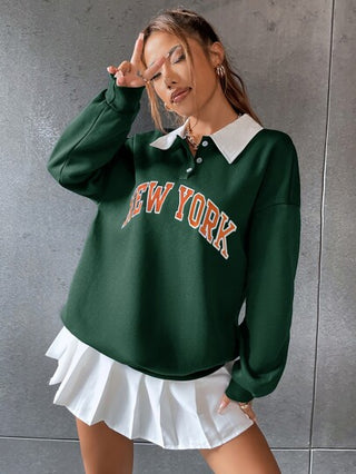 MOOSTA بلوزة شعار البولو بأكمام قصيرة مع رسومات حرفية، طويلة الأكمام