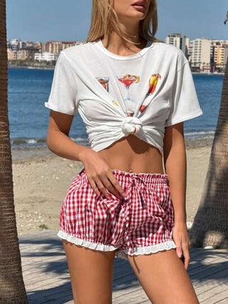 Muchica سروال قصير كاجوال للنساء بنمط مربع ولتطريز دانتيل مفرغ