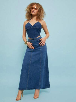 NYA SZN تنورة جينز كاجوال طويلة عالية الخصر قصة A للنساء