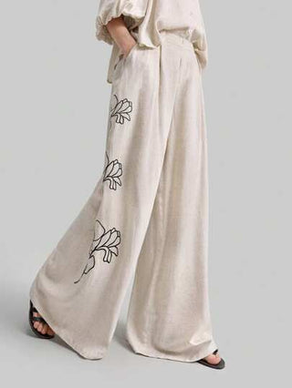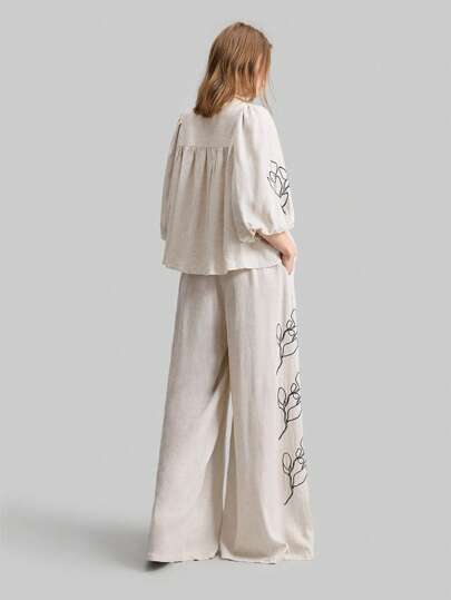 Ontre مجموعة بلوزة نوم وسراويل عريضة ألوان كتان, تطريز أزهار، نمط بوهيمي، سهل وراحة للاصطياف