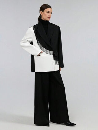Ontre بدلة نسائية جديدة موضة ربيع 2025، عيد الحب، جاكيت بدلة نسائية غير متماثل مزين بشرابات ملونة، أسود وأبيض غير متماثل مع ديكور شرابات اللؤلؤ