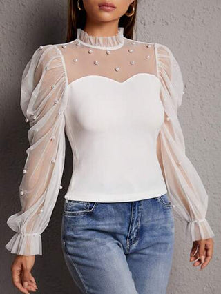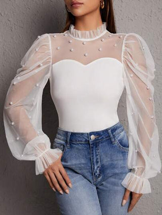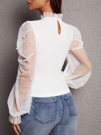 PETITE بلوزة مطرز بلؤلؤ شبكة متباينة اكمام واسعة بعنق رتوش