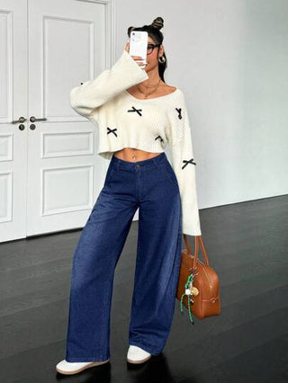 PETITE بناطيل جينز نسائية عادية واسعة الساق منخفضة الخصر متسخة