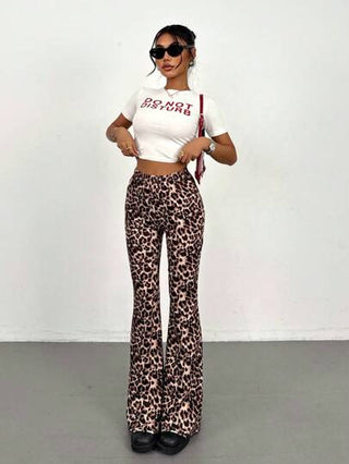 PETITE بنطلون أنيق للنساء ذو خصر مطاطي وأرجل متسعة مطبوع بنمط النمر